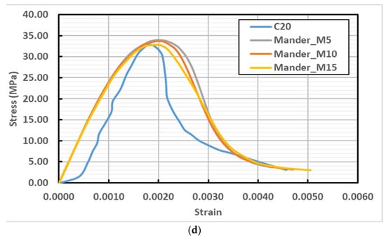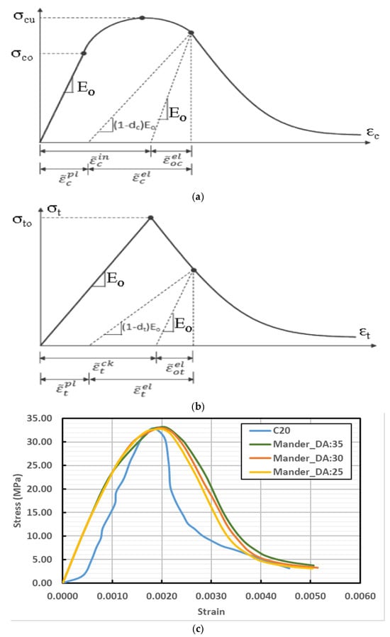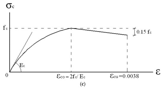 Mander et al. [49] proposed a unified stress–strain model for confined concrete applicable to circular and rectangular sections with transverse reinforcement. Figure 3a illustrates the model’s parabolic ascending branch followed by a ductile post-peak response, with the vertical axis representing the concrete compressive stress; here, Fcc denotes the compressive strength of confined concrete, whereas Fco corresponds to that of unconfined concrete. The Hognestad model describes a linear strain decrease following an initial parabolic rise to peak stress, remaining valid up to a final strain of 0.0038. The equations governing this curve are presented in Figure 3b. Here, σc represents concrete stress, εc stands for concrete strain, and εcu is the strain at which maximum stress is attained by unconfined concrete. The stress–strain relationship in the unconfined Kent and Park model [50] features a parabolic ascent to peak stress, followed by a linear decline until reaching . Figure 4c displays the stress–strain curves for each of the three models. Figure 4c compares finite element results for C20 concrete using the Mander, Hognestad, and Kent–Park models, with the Mander model showing the closest agreement to experimental data in peak strength and post-peak softening; the Hognestad model exhibited a stiffer ascending branch, while the Kent–Park model underestimated ultimate strain, emphasizing the critical role of accurate material model calibration in concrete compression simulations. Mander et al. [49] unified model describes confined concrete with a parabolic rise and ductile post-peak behavior (Fcc vs. Fco), while the Hognestad model features a linear strain decrease after a parabolic peak. Valid to a strain of 0.0038 (Figure 3b), the model defines σc, εc, and εcu, while the Kent and Park model [50] shows a parabolic rise to peak stress then a linear drop to ε50u. Figure 4c compares the stress–strain curves from finite element analyses of C20 concrete using the Mander, Hognestad, and Kent–Park models. The Mander model exhibited the highest fidelity to experimental results, accurately capturing peak compressive strength and post-peak softening, whereas the Hognestad model produced a comparatively stiffer ascending branch and the Kent–Park model underestimated the ultimate strain capacity, highlighting the critical importance of precise material model calibration in finite element simulations of concrete compression behavior.