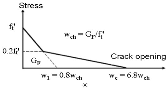 Figure 4 illustrates the concrete behavior model under uniaxial tension. Figure 4a shows the bilinear tensile behavior, capturing both the initial linear elastic response and the strain-softening after cracking. Figure 4b presents the biaxial yield surface of concrete in the CDP model, which defines the interaction of multiaxial stress states and governs the onset of plastic deformation. Figure 4c depicts the stress–strain models for C20 class concrete, representing the full tensile response, including post-cracking softening. Together, these subfigures demonstrate the failure mechanisms, damage evolution, and plastic deformation in concrete under tension. This comprehensive representation highlights how the CDP model and constitutive stress–strain relationships can accurately simulate concrete’s tensile behavior for finite element analyses.