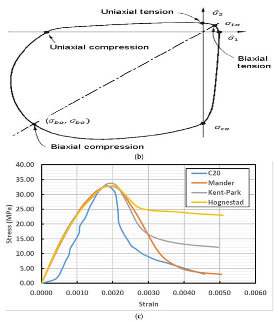 Figure 3 illustrates the models of concrete behavior under uniaxial compression. Figure 3a shows the Mander concrete model, which captures the nonlinear stress–strain response of confined concrete and accounts for the effects of confinement on peak strength and ductility. Figure 3b presents the Kent and Park concrete model, representing both the ascending and descending branches of the stress–strain curve, and is commonly used for modeling reinforced concrete structures. Figure 3c depicts the Hognestad concrete model, which characterizes the compressive behavior of concrete up to and beyond the peak stress, emphasizing post-peak softening. These models provide different approaches to simulate concrete’s mechanical response, helping to predict structural performance accurately. Overall, they serve as essential tools in finite element analysis and design of concrete structures. Figure 4 shows the concrete behavior model under uniaxial tension. Figure 4a shows the bilinear tensile behavior, capturing both the elastic response and post-cracking softening. Figure 4b shows the biaxial yield surface in the CDP model, while Figure 4c shows the stress–strain relationship for C20 concrete. Together, these subfigures highlight the failure mechanisms and the evolution of damage and plasticity under tensile loading.