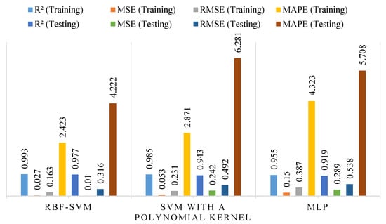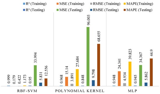 Table 3 shows that the SVM-RBF kernel achieves a correlation coefficient of R2 = 0.999 (MAPE = 1.173%, RMSE = 0.422, and MSE = 0.179) for Fc. This kernel’s performance is more accurate than the SVM–polynomial kernel (R2 = 0.968, MAPE = 27.684%, RMSE = 3.891, and MSE = 15.140) and MLP (R2 = 0.948, MAPE = 39.823%, RMSE = 4.934, and MSE = 24.341) in the training case. In the testing case, the SVM-RBF kernel achieves a correlation coefficient of R2 = 0.95 (MAPE = 12.556%, RMSE = 5.831, and MSE = 33.994) for Fc. This kernel’s performance is more accurate than the SVM–polynomial kernel (R2 = 0.848, MAPE = 68.655%, RMSE = 9.798, and MSE = 96.003) and MLP (R2 = 0.945, MAPE = 44.9%, RMSE = 5.862, and MSE = 34.3367). Figure 5 presents the evaluation metrics used to assess the performance of SVM and MLP models in predicting the Fc of cement mortar. Both training and testing results are included to demonstrate the models’ ability to learn from data and generalize to unseen samples. The SVM model was evaluated using both RBF and polynomial kernels to analyze the effect of kernel selection on predictive performance. The MLP model was trained with different network architectures to optimize its ability to capture nonlinear relationships in the dataset. Key metrics such as R2, RMSE, and MAE were used to quantify the accuracy and reliability of each model. Higher R2 values indicate a stronger correlation between experimental and predicted results, while lower RMSE and MAE values reflect smaller prediction errors. Figure 6 allows direct visual comparison of predicted versus experimental values, highlighting the performance of each model. The results show that both SVM and MLP can reliably predict Fc, although their performance varies depending on model type and parameter selection. Training results demonstrate the models’ capacity to fit the data closely, whereas testing results highlight their ability to generalize. Figure 5 and Figure 6 emphasize the importance of proper hyperparameter selection, including the kernel type for SVM and the number of hidden layers for MLP.