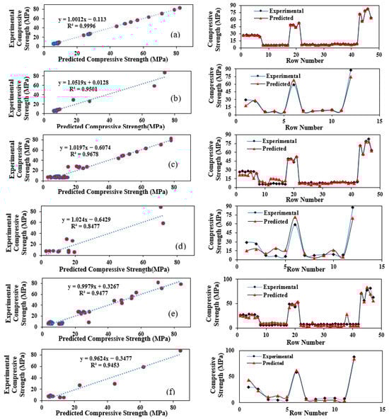 It is worth noting that the horizontal and vertical axes represent the experimental and predicted values of Fc, respectively. The relationships between the predicted and experimental values of Fc (or Fs) for the training and testing data are shown in Figure 6, Figure 7 and Figure 8. In part B of Figure 6, Figure 7 and Figure 8 the horizontal axis represents the amount of data in the training or testing models, while the vertical axis shows the predicted and experimental values of Fc or Fs, respectively. Figure 6 shows the relationship between the experimental and predicted Fc of cement mortar. Figure 6a,b presents the results of the SVM-RBF model for training and testing, respectively, illustrating the model’s accuracy in predicting Fc. Figure 6c,d shows the SVM with polynomial kernel results for training and testing, highlighting its predictive performance. Figure 6e,f depicts the MLP model outcomes for training and testing, demonstrating the neural network’s ability to capture nonlinear trends. The figure emphasizes the close agreement between experimental data and model predictions across all methods, particularly in Figure 6a,b. These results confirm the reliability of the machine learning models in predicting cement mortar compressive strength.