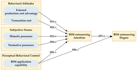 The impact of behavioral intention on actual behavior has been extensively corroborated within the disciplines of sociology and psychology. The TPB asserts that the intention to participate in a particular behavior, whether by an individual or an organization, serves as a necessary precursor for the actual execution of that behavior. research have demonstrated that behavioral intention exerts a positive effect on actual behavior [,]. BIM outsourcing intention reflects the extent to which construction enterprises are willing to outsource BIM tasks to third-party companies and the effort they are willing to invest in achieving this goal. BIM outsourcing is a common phenomenon, but the extent of outsourcing varies significantly. This variation is because of the enterprise’s outsourcing intention reflects its level of trust in external collaboration. Enterprises with higher outsourcing intention generally have greater trust in the capabilities and reputation toward third-party companies, making them more willing to delegate more work to external teams []. This trust encourages companies to loosen their control during the outsourcing process, thereby further increasing the extent of outsourcing. Conversely, enterprises with lower outsourcing intention often have doubts about the BIM application capabilities and reputation of third-party companies, resulting in a lower scope and depth of BIM outsourcing. Drawing upon the prior analysis and the conducted interviews, this paper posits the following hypothesis: