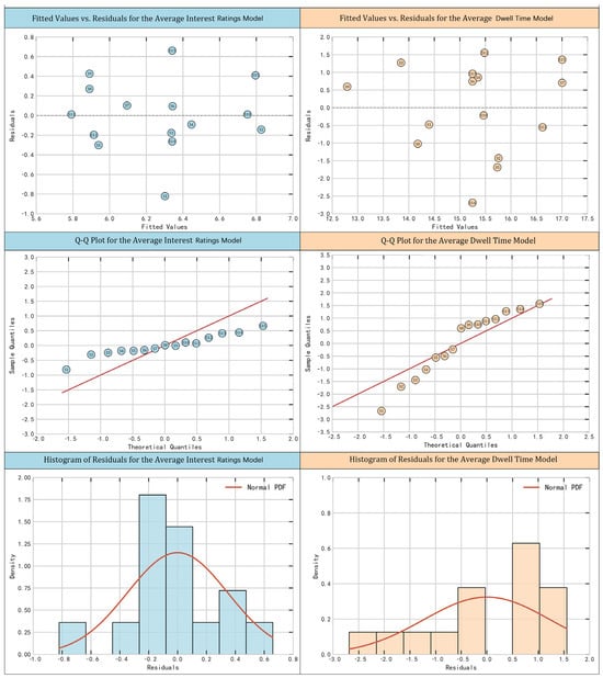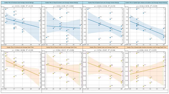 - Light–Shadow Articulation: For the interest ratings model, the coefficient was −0.057 (t = −1.47, p = 0.146) with a confidence interval from −0.127 to 0.014. For the dwell time model, the coefficient was 0.156 (t = 3.42, p = 0.001) with a confidence interval from 0.066 to 0.246.