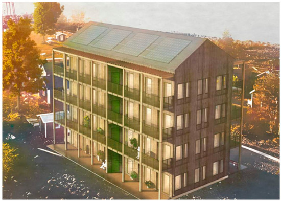 The case study was a multifamily house unit with two floors and a gross floor area of 377 m2. It is structurally designed to support the load of up to four floors. The exterior wall elements consist of wood and are constructed of standing wooden latches with milled channels where stagnant air creates insulation. The interior walls are designed to be easily moved or taken apart to accommodate changes in building function or layout. The load-bearing structure includes lightweight wooden beams, capable of spanning long distances and supporting up to eight floors. The foundation is made of foam glass and steel latches and is designed to manage a load of four floors. An illustration of the building is presented in Figure 1 and the materials used in its construction are presented in Table 2.