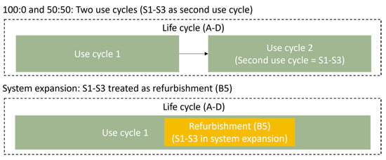 - The 100:0 approach: The 100:0 approach is sometimes referred to as avoided burden [28] or the cut-off approach [19] and allocates the burden to the use cycle in which it occurs. This is the approach found in the European standards such as EN 15978:2011 and EN 15804:2012 [30] and is aligned with the “polluter pays” principle. For a building designed for disassembly and flexibility this means the burden of reuse or recycling is allocated to the use cycle in which those processes occur. Thus, the initial use bears the full impact of, for example, material production, while subsequent uses are considered free of that impact. The burden from EoL is attributed to the final use cycle. The 100:0 approach promotes the use of reused and recycled materials rather than the system that provides the reused or recycled materials [27]. Potential benefits from future reuse and recycling are instead presented as benefits beyond the system boundaries in module D.