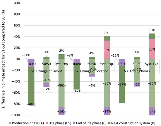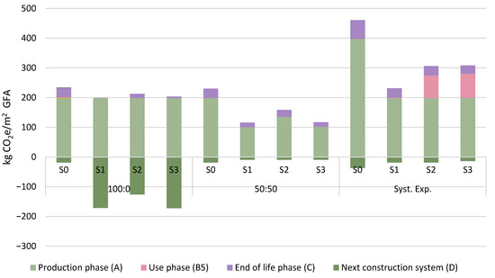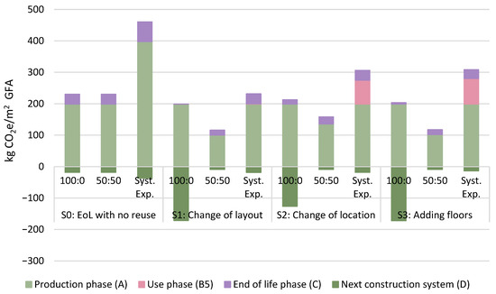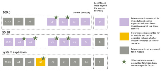 Further, the result varies depending on if module D is included or not. If only including the system boundary (modules A–C), the 50:50 approach results in the lowest total climate impact. However, if module D is included, and not reported outside the system boundary, the 100:0 approach shows the overall lowest impact. System expansion shows the greatest reduction compared to the linear scenario, S0, but this depends on the assumption that the original building is replaced with a new one in the second use cycle, which introduces added uncertainty.