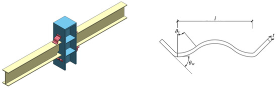 According to the literature [21], welding inner corrugated plates at beam–column connections can effectively enhance the progressive collapse resistance of steel-frame structures under column-loss scenarios. However, welding plates to the inner side of beam flanges presents practical challenges, with difficulties in both assembly and ensuring weld quality. To address this limitation, a novel reinforced joint—designated as welded steel-frame joints strengthened by outer corrugated plates (WSOC)—was proposed (Figure 1). This solution involves welding corrugated plates between the outer side of the beam flanges and the column. Figure 1 also shows the details of the corrugated plate, which presents a shape of “W” (the tilting of the corrugated plate end is to better connect it with the beam or column). Each corrugated plate is composed of a central angle (θc), corrugated-plate thickness (t), corrugated-plate width (w), length of circular arc (l), and welding angle (θw). Similar to the method producing the inner corrugated plates in [21], the outer corrugated plates can also be formed by cold bending steel plates using special molds, making the processing of the outer corrugated plates very simple. Furthermore, the corrugated plates and beams, as well as the corrugated plates and column, were connected by full-penetration butt welding.