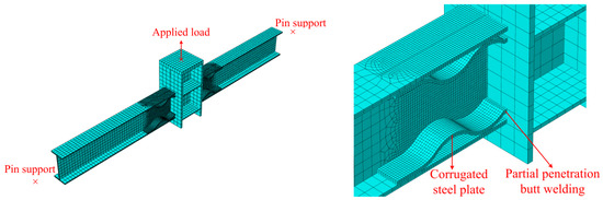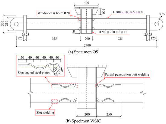 Progressive collapse often involves dynamic effects, but quasi-static analysis focuses more on the redistribution of internal forces and the development process of anti-progressive collapse mechanisms. Therefore, quasi-static analysis was adopted to explore the anti-progressive collapse performance of the novel type of joint. Reference [21] shows two test specimens labeled OS (original specimen) and WSIC (welded joint strengthened by inner corrugated plates), as shown in Figure 2. The specimens were made of grade Q235B steel. The sectional dimensions for beams and columns were H200 × 100 × 5.5 × 8 mm and H200 × 200 × 8 × 12 mm, respectively. All specimens featured a 2400 mm span. The mechanical properties of the specimens are presented in [21]. Full-penetration butt welding was adopted in the connections of specimen OS. Based on the OS, specimen WSIC was reinforced with an 8 mm thick corrugated steel plates. The column and corrugated plates were connected by partial penetration butt welding, while the beam and corrugated plates were connected through slot welding. It should be noted that in order to verify the correctness of the simulation of the welding, the specimen with partial penetration butt welding was specifically selected here. In fact, from the perspective of the specimen itself, full-penetration butt welding and partial penetration butt welding had little effect on its bearing capacity and ductility, but only changed the failure mode of the specimen, which has been described clearly in [21].