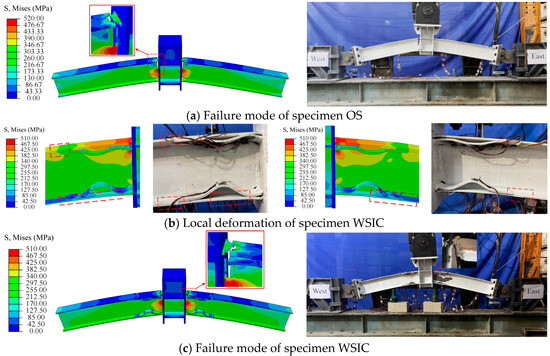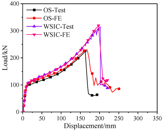 Figure 5 compares experimental and FE load–displacement curves. The FE results demonstrated strong agreement, with experimental trends throughout both elastic and plastic stages. The peak load and ultimate displacement discrepancies between experimental and FE curves were within 2% (the ratio of the FE results to experimental results was as follows: for the WSIC, the peak load and ultimate displacement were 1.02 and 0.99, respectively; for the OS, the peak load and ultimate displacement were 1.01 and 1.02, respectively), confirming excellent model validation.