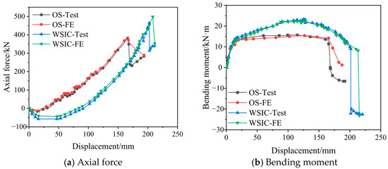 Comparison of the axial force and bending moment curves between the test and FE analysis.