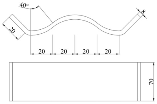 A case of WSOC with the same size and as the specimen OS was designed, and four corrugated plates of the same size were installed on the outside of the joint area. The dimensions of the outer corrugated plate are shown in Figure 8. The anti-collapse behavior of the WSOC was investigated using the same modeling method, model parameters, boundary conditions, and loading scheme, as in Section 3.2. Figure 9 presents the FE model of the WSOC.