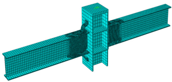 Damage fracture simulation is a continuously focused-on issue in anti-collapse research, involving fields such as material microstructure and fracture mechanics. The specific damage simulation is described by fracture displacement, fracture strain, stress triaxiality, and strain rate [24]. A small fracture strain was adopted to accurately simulate the weld fracture in partial-penetration butt welding. Taking specimen WSIC as an example, the FE model is shown in Figure 4.