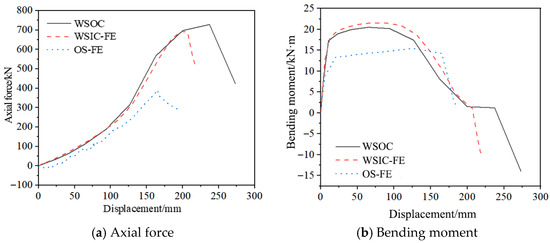 Figure 11 compares the internal force curves of the OS, WSIC, and WSOC at the section near the end support under FE analysis. The axial force displacement and bending moment displacement curves exhibited similar development trends across all three models. During initial loading, the bending moment increased linearly and rapidly, while axial force development was slow, indicating bending-dominated behavior in this phase. Subsequently, the growth rate of the bending moment decreased until stabilizing. Following cross-section fracture, the bending moment dropped abruptly. Axial force remained tensile throughout loading, with its growth rate accelerating progressively until extensive fracture occurred in the cross-section.