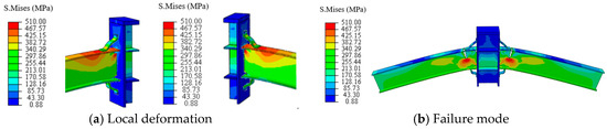 Moreover, after considering the damage parameters, the failure process and mode of two specimens were the same as the test phenomena, and the fracture location was also in good agreement with the test results (Figure 7). Especially for specimen WSIC, the inner corrugated plates at the upper flange were almost completely straightened, and then the upper flange fractured near the connection with the column, which was completely consistent with the phenomenon observed in the test. Therefore, the damage parameter setting in the FE model was effective.