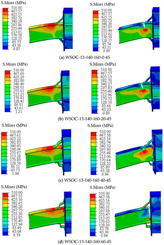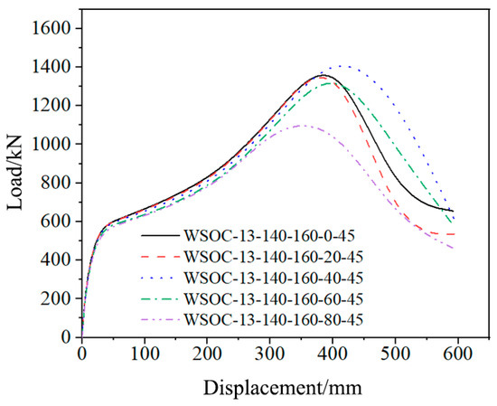 On the basis of WSOC-13-140-160-40-45, the FE analysis results with θc as a variation parameter while keeping other parameters unchanged are displayed in Figure 13. The failure modes of the WSOC under different central angles are exhibited in Figure 14. WSOC-13-140-160-40-45 signifies the WSOC with a corrugated plate thickness of 13 mm, corrugated plate width of 140 mm, length of circular arc of 160 mm, central angle of 40°, and welding angle of 45°.