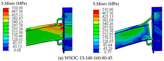 Corrugated plate width significantly influenced both the bearing capacity and failure mode of the WSOC joint. As w increased, the joint’s bearing capacity initially rose before decreasing. This was mainly because the excessively small w had a relatively small impact on the joint, while the excessively large w resulted in a relatively large proportion of the early beam mechanism, which limited the later play of the catenary mechanism. At w was equal to 80 mm or 100 mm, the plastic zone concentrated within the beam–column connection area, ultimately fracturing. By contrast, when w was greater than 100 mm, a double-plastic zone was formed on the flange of the beam outside the connection area, where fracture occurred. When w was equal to 100 mm, the best anti-collapse performance of the WSOC was achieved.