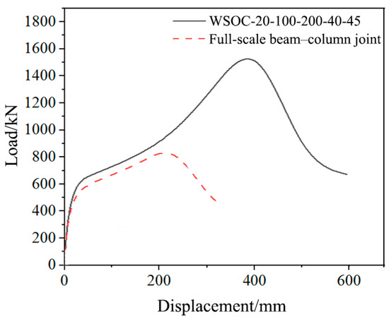 According to the proposed suggestions, the beam–column joint in Section 4.3 (full-scale beam–column joint) was strengthened with the following dimensions (WSOC-20-100-200-40-45): the central angle, corrugated plate thickness, corrugated plate width, length of circular arc, and welding angle of the outer corrugated plates were 40°, 20 mm, 100 mm, 200 mm, and 45°, respectively. Figure 16 displays the reinforcement effect of the corrugated plates on the corresponding traditional beam–column joint under the design proposals.