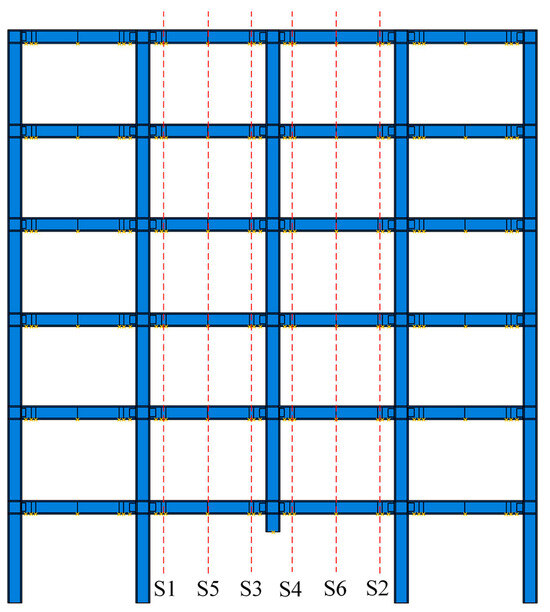 Whether the outer corrugated plate is still effective in terms of overall structures is the key to its application. Three full-scale four-span plane steel-frame models were analyzed, namely traditional steel frame (TF), steel frame strengthened by outer corrugated plates (FSOC), and steel frame strengthened by inner corrugated plates (FSIC). The basic dimensions of three frames were the same, with a floor height of 3 m, a total of 6 floors, and a column spacing of 4.8 m. The cross-sectional dimensions and material properties of beams and columns were identical to those specified in Section 4.3. The central angle, corrugated plate thickness, corrugated plate width, length of circular arc, and welding angle of the outer corrugated plates were 40°, 20 mm, 100 mm, 200 mm, and 45°, respectively. The inner corrugated plates featured a 20° central angle, a 20 mm thickness, and a 200 mm circular arc length. Figure 17 illustrates the geometric configuration and FE model of the three frames, where S1–S6 denote cross-sectional positions designated for subsequent analysis. Pushdown analysis was executed by imposing a vertically downward displacement on the first-floor middle column.