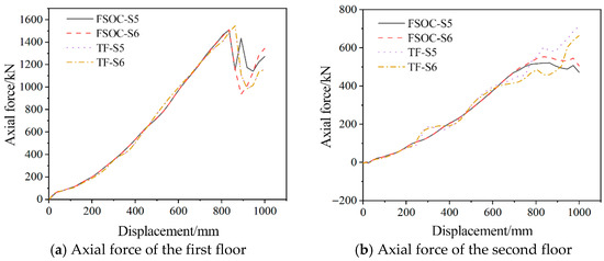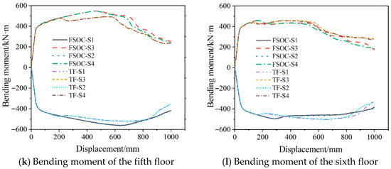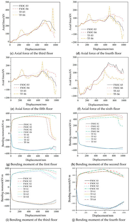 Figure 20 compares the internal force curves of the FSOC and TF on each floor at different cross-sections. As shown in the figure, both models exhibited consistent development trends and magnitudes for beam-end bending moments. However, axial force progression diverged slightly due to Vierendeel mechanism activation throughout the structural frame. The axial tension was mainly concentrated in the lower floors, and the upper floors were mainly under compression. It was worth noting that the sixth-floor beam exhibited negative axial forces prior to reaching 340 mm displacement in the FSOC. As the displacement increased, the negative value began to transform into a positive value, corresponding to the beam transitioning from a compressive state to a tensile state.