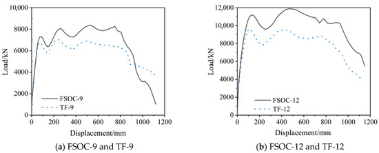 Furthermore, the anti-collapse performance of the FSOC with a total height of nine and twelve floors under the failure of the middle column on the first floor was also analyzed. The analysis results are shown in Figure 22. Specifically, FSOC-9 and TF-9 denote the FSOC and TF with a total height of nine floors, and so on. Compared with the TF-9, the peak load of the FSOC-9 increased by 22.9% and the ultimate displacement increased by 26.0% when the middle column failed. Similarly, compared with the TF-12, the ultimate load and displacement of the FSOC-12 increased by 24.4% and 18.1%, respectively. From the perspective of bearing capacity, the application effect of the outer corrugated plates was better in the structure with higher overall height. However, after using the outer corrugated plates, the ductility of the structure with lower overall height was significantly improved. Due to limited examples, the influence of the number of floors on the anti-collapse performance of the FSOC is not yet known, and further analysis can be conducted in the future.