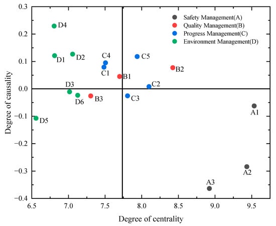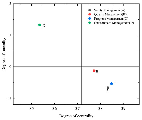 Table 7 shows the centrality and cause degrees of the first-level indicators, in which the centrality degrees of progress management and safety management are 38.4806 and 38.3305, respectively, indicating that these two factors have an important position in the indicator system, which is a key aspect of the current construction of intelligent construction sites in the Urumqi region. Quality management has a slightly lower centrality degree (37.7229), but its cause degree (−0.1254) is higher than that of progress management (−0.5396) and safety management (−0.6638), which indicates that the construction of quality management of smart construction sites in Urumqi region is relatively independent of the other two management modules and is less influenced by other factors. It should be noted that although the centrality degree of environmental management (35.3467) is the lowest among the four level 1 indicators, its cause degree (1.3288) is the highest, with a higher degree of influence on the other three indicators, which indicates that the Urumqi region has fully considered the environmental management factors in the process of smart construction site construction, which may be since the Urumqi region is located in the inland hinterland with special climatic conditions, and the environmental factors have a significant influence on the other factors have a significant influence. In addition, China’s environmental protection efforts have been gradually increasing, and environmental pollution in the construction industry needs to be emphasized. Therefore, environmental management factors can affect the schedule, capital investment, and quality standards.