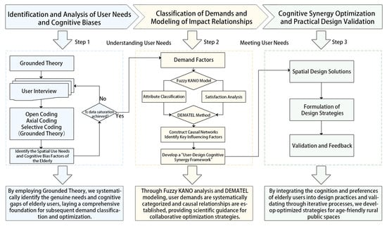Despite these advancements, several limitations persist in the context of age-friendly spatial design, particularly in rural settings. First, although multi-method integration has proven effective in product and service domains, its applicability to socially complex, spatially embedded rural public spaces remains underexplored. Second, many studies emphasize the user perspective, while overlooking the designer’s cognitive framework, including their assumptions, knowledge structures, and interpretive filters. This creates a disconnect where “collaboration” becomes symbolic or superficial, lacking mechanisms for cognitive convergence and meaningful co-creation. In response, this study proposes a User–Designer Cognitive Alignment Framework that integrates Grounded Theory to reveal cognitive divergence, the FKANO model to classify and prioritize user needs, and the DEMATEL method to map causal relationships among needs. This integrated methodology enables structured modeling of collaborative design processes and provides empirical validation and actionable strategies for building consensus and supporting decision-making in complex age-friendly design contexts.