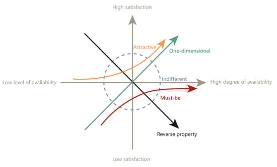 The Kano model is a qualitative tool widely used to categorize user needs and determine design priorities. It illustrates the nonlinear relationship between design features and user satisfaction, as shown in Figure 2 [,]. However, traditional Kano analysis cannot fully capture subjectivity and uncertainty in user feedback. The FKANO model addresses this by integrating fuzzy logic and fuzzy set theory, allowing for a more accurate evaluation of user expectations [,].