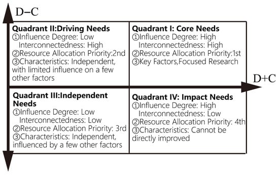 - Expert evaluation was conducted on the FKANO-screened needs to build a Direct Influence Matrix. DEMATEL was then applied to uncover causal relationships, calculate prominence (D + C) and net influence (D − C), and identify key driving and dependent factors. Importantly, DEMATEL also acted as a validation step: Must-be and high-priority One-dimensional items identified in FKANO were expected to emerge as causal drivers with high prominence, whereas Attractive items were more likely to appear as dependent effects. Any inconsistencies were examined and reconciled through contextual interpretation, thereby cross-validating the robustness of the FKANO classification.