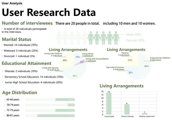 A purposive sampling approach was adopted to recruit elderly residents from villages in Jiangning District, Nanjing, Jiangsu Province, for in-depth interviews conducted between March and May 2025. The final sample size was determined based on the principle of theoretical saturation, resulting in a total of 20 participants representing a diverse cross-section of the rural elderly population. Basic information about the interviewees is provided in Figure 4. Each participant participated in a face-to-face interview guided by a semi-structured protocol (Appendix A). The interviews, lasting approximately 20–30 min each, were fully audio-recorded. After each interview, transcripts were promptly compiled and returned to participants for review and verification, ensuring data accuracy and completeness.