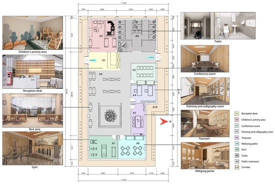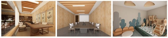 Interactive spaces such as chess rooms, tea lounges, and multipurpose areas (Figure 11) foster community communication. Intergenerational zones combine children’s play areas with nearby seating for grandparents, implementing Social Interaction (D31, M) and Activity Participation (B13, O). Modular furniture and flexible layouts enhance inclusivity and embed Sense of Belonging (B14, A) and Intergenerational Integration (B15, O).