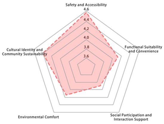To evaluate the practical feasibility and user satisfaction of the optimized age-friendly rural public space design, a comprehensive post-occupancy evaluation was conducted. The assessment involved 20 elderly users and 5 grassroots government officials, who rated the design across five critical dimensions: (1) safety and accessibility, (2) functional suitability and convenience, (3) support for social participation and interaction, (4) environmental comfort, and (5) cultural identity and community sustainability.