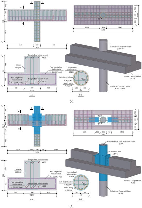 Two 1/3 scale beam–slab–column top-layer joints including reinforced concrete frame joint (TLJ-1) and assembled steel–concrete composite (ASCC) joint (TLJ-2) are designed in accordance with the Chinese codes [] and experimentally tested under a constant axial load and a cyclically reversed load. To authentically reflect the seismic performance of joints of the prototype structure, the scale specimens ensured that the corresponding joints of the prototype structure have the same axial compression ratio, reinforcement ratio and the same bending capacity ratio of column and beam (Mcu/Mbu) in the section design process, and meet the requirements of the anchorage structure of the reinforcements in the two joints. The dimensions and reinforcement details of TLJ-1 and TLJ-2 are presented in Figure 1a,b and Table 1. In the experiment, TLJ-1 represented the beam–slab–column joint with an identical reinforcement ratio to the station prototype. The concrete column has a height of 2480 mm, and the diameter of the column section is 400 mm. The cross-section of inverted T-shaped concrete beam is 400 mm × 730 mm with the 330 mm thickness of slab. TLJ-2 was the ASCC joint using a circular CFST column and steel members joined by using high-strength grade bolts with a preload of 225 kN. The detailed dimensions are shown in Figure 1c.