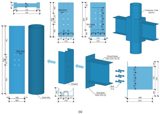 Schematic diagram of top-layer beam–column joints (mm): (a) TLJ-1; (b) TLJ-2; (c) Details of steel member connection.
