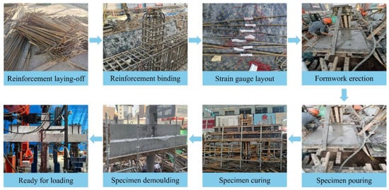 The specimen fabrication process, as illustrated in Figure 2, comprised four principal stages. First, steel reinforcements were cut and shaped, then the assembly of reinforcement cages was carried out with integrated strain gauge installation. After the template was built and the concrete was poured, finally the specimen was maintained.