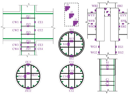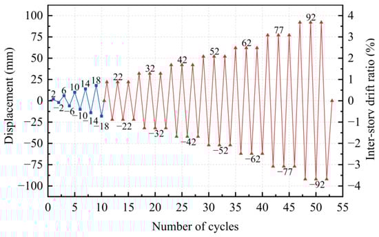 To truly reflect the seismic performance of the beam–column joints of the prototype structure, the joint specimens used in the test were cut from the inflection points of the beams and columns of the actual frame structure. The axial load was maintained at 2050 kN (corresponding to the axial compression ratio of 0.75) through hydraulic jacks to simulate complex geostatic stresses induced by substantial overburden in underground metro station structures and precisely measured using an external pressure sensor, while cyclic horizontal displacements were imposed using an MTS servo-controlled actuator. Horizontal loads and displacement data at the column ends were monitored by load transducers and displacement transducers installed on the actuator. In addition, strain responses measured by carefully attached strain gauges at designated locations were automatically collected and recorded by the MTS acquisition system to investigate the mechanical performance and deformation behavior of top-layer joints, as illustrated in Figure 4. Upon reaching specified displacement levels, crack variations and widths were meticulously documented using the crack observation instrument. The hinged supports were installed at the end of beams, while the sliding support was installed at the hydraulic jack on the top of the column to simulate vertical and horizontal hinged behavior at the inflection point. And the fixed hinged support was installed at the bottom of the column to ensure that the boundary conditions and load conditions are equivalent to the actual structure. Specimens underwent preloading protocols prior to formal testing, and the cyclic loading scheme adopted in the test is presented in Figure 5. The experimental loading scheme strictly adhered to Chinese codes [], and all specimens underwent preloading procedures prior to formal testing. Cyclic loading was administered at a controlled rate of 0.2 mm/s to ensure loading continuity and uniformity during repeated cycles. The test was terminated when specimens reached their ultimate bearing capacity, when the load decreased below 85% of the peak load (Pmax), or when specimens demonstrated incapacity to sustain the applied loads.