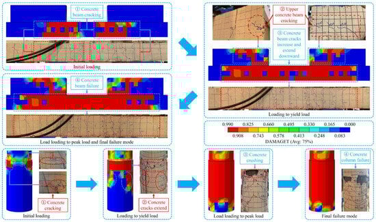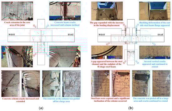 Figure 6a depicts the crack development and damage progression of specimen TLJ-1. During elastic loading phases, no significant deformations were observed. As loading progressed, horizontal cracks initially appeared in the concrete column, with crack widths not exceeding 0.05 mm. At a load displacement of 200 kN, minor oblique cracks emerged at the beam terminus. The first diagonal crack developed when the load displacement reached 22 mm. With continued loading, multiple lateral cracks propagated on the concrete column, with pre-existing cracks progressively widening. At this stage, the maximum column crack width increased to approximately 0.6 mm. Upon approaching the ultimate bearing capacity, several column cracks continued to extend downward, while beam cracks enlarged without substantial width variation. Notably, a significant concrete spalling occurred on the column surface, exposing the underlying reinforcement and stirrups. A significant sound was produced at a load displacement of 42 mm, spalling with internal reinforcement fracture and extensive concrete crushing, exhibiting the final failure mode of “strong beam and weak column”.
