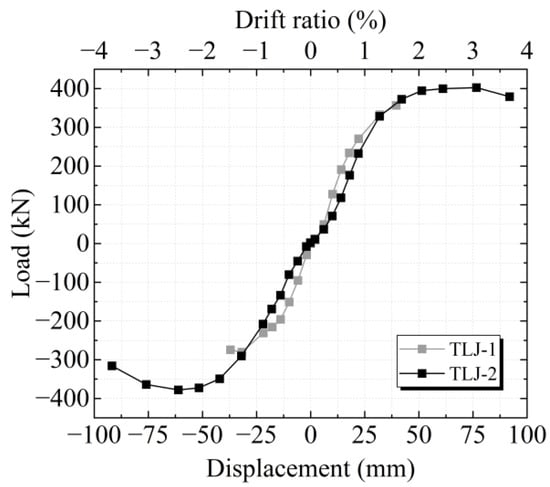 Hysteresis curves serve as a critical methodology for evaluating the seismic performance of specimens TLJ-1 and TLJ-2. Figure 7a,b depict the hysteresis curves at the column top of both specimens. The hysteresis characteristics of the top-layer beam–column joints (TLJ-1 and TLJ-2) exhibited significant similarities. During the initial loading stages, the hysteresis loops displayed narrow widths and limited areas. As the loading displacement increased, progressive crack propagation within the specimens led to a gradual reduction in both positive and negative stiffness. The hysteresis curves of TLJ-1 and TLJ-2 exhibited robust profiles, marked by a distinct “pinch” phenomenon. For the reinforced concrete frame joint TLJ-1, the “pinch” phenomenon attributed to bond-slip mechanisms under cyclic loading conditions. While for the ASCC joint TLJ-2, under the dual influence of bond-slip mechanisms and bolt slippage due to the serious deformation of the extended plates, the hysteresis curves also exhibited the “pinch” phenomenon. In the final loading phase, the hysteresis loops underwent morphological transformation, transitioning from a spindle-like shape to an anti-S-shaped profile, signifying a critical structural response. Due to the dimensional variations in steel members and concrete cracks causing cumulative and irreversible damage, which contributes to the observed asymmetry in hysteresis curves. Notably, the implementation of steel members connections at the ASCC joint significantly enhanced the specimens’ stiffness, ultimate bearing capacity, and hysteresis loop area, particularly for top-layer joints designed under the “strong column and weak beam” principle.