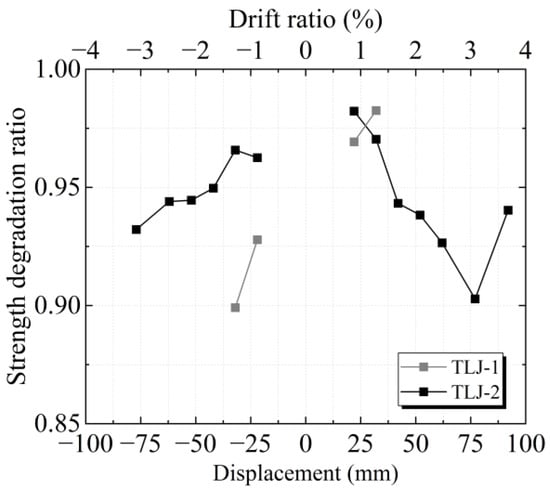 TLJ-1 and TLJ-2 joint specimens experienced rapid failure at displacements of +42 mm and −92 mm, respectively, without undergoing cyclic loading and were therefore excluded from the strength degradation analysis. Both specimens demonstrated strength degradation ratios exceeding 0.85, indicating that the joints maintained relatively stable load-bearing capacity under column-top cyclic loading. The observed failures primarily originated from localized component damage, while the overall strength of the joint is still guaranteed when the component is destroyed.