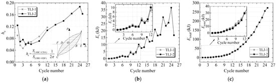 During the elastic phase, the relationship between he and cycle number remained relatively constant, indicating minimal energy dissipation as specimens maintained elastic behavior (Figure 11a). With increasing column top displacement, all specimens entered the yield phase, accompanied by a rapid increase in he values. Specimen TLJ-1, having the highest initial tangent stiffness, reached the energy-consuming condition first but exhibited reduced energy dissipation capacity. Despite improved plastic deformation performance, the specimens showed some variation in cyclic energy dissipation capacity.