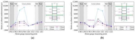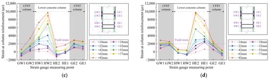Given that crack development in TLJ-1 and TLJ-2 predominantly occurred within the lower concrete column regions, the analysis primarily focused on column longitudinal reinforcement strains. Comparative analysis adopts strain data from the peak points during the first cycle of each loading level in the loading phase, with column longitudinal reinforcement strain distributions illustrated in Figure 12.
