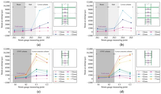 Strain at stirrup of TLJ-1 and TLJ-2: (a) TLJ-1 (positive); (b) TLJ-1 (negative); (c) TLJ-2 (positive); (d) TLJ-2 (negative).
