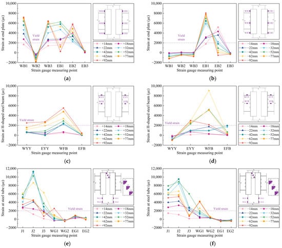 Strain at steel members of TLJ-2: (a) end plate of H-shaped steel beam (positive); (b) end plate of H-shaped steel beam (negative); (c) upper flange and web of H-shaped steel beam (positive); (d) upper flange and web of H-shaped steel beam (negative); (e) steel tube in core area of TLJ-2 (positive); (f) steel tube in core area of TLJ-2 (negative).