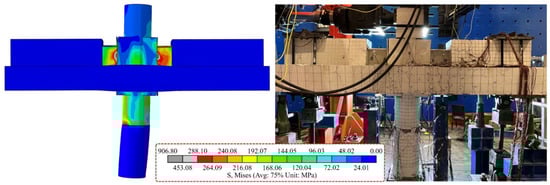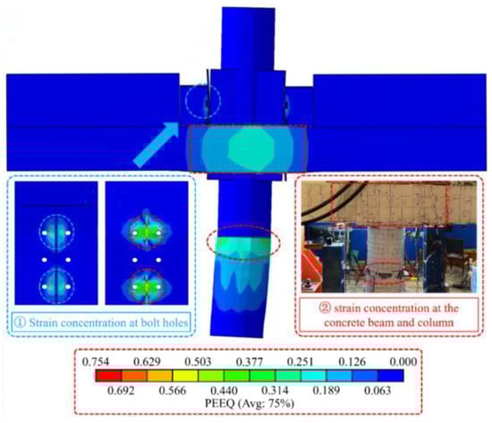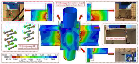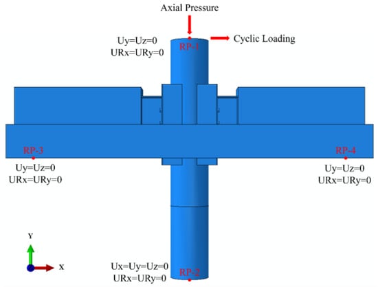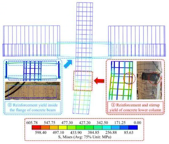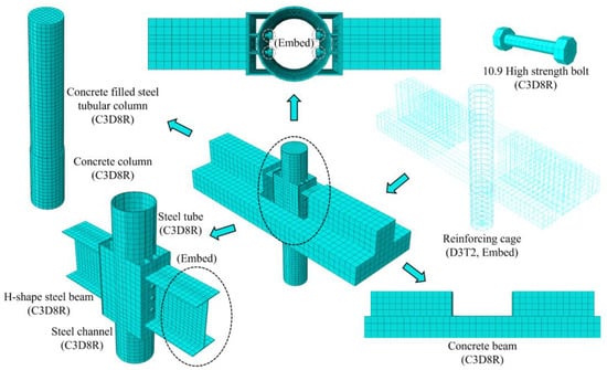 In the finite element modeling of ASCC joint, distinct contact interactions were implemented to simulate the mechanical behavior of components. The “Embedded Region” contact was applied to integrate reinforcement elements directly into the joint region, while H-shaped steel beams and high-strength bolts were partially embedded into the concrete beam and CFST column, respectively. For welded connections in the steel members, the “Tie Constraint” contact was adopted to simulate the welding areas. For other contact surfaces, the “Surface-to-surface” contact was utilized in the contact regions, employing “Coulomb friction” and “Hard contact” to simulate the tangential and normal contact characteristics of the contact surface, respectively, and permitting either contact or separation without interpenetration. Accounting for surface roughness effects, the friction coefficients were specified as 0.6 for steel–concrete interfaces and 0.3 for steel–steel contact surfaces [].