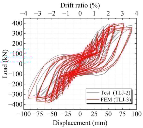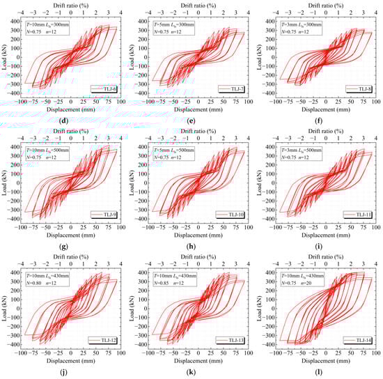 Hysteretic curves of FEM (TLJ-3~TLJ-14): (a) TLJ-3; (b) TLJ-4; (c) TLJ-5; (d) TLJ-6; (e) TLJ-7; (f) TLJ-8; (g) TLJ-9; (h) TLJ-10; (i) TLJ-11; (j) TLJ-12; (k) TLJ-13; (l) TLJ-14.