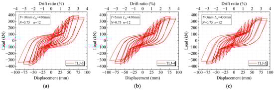 The variable parameters were steel tube thickness (T = 10, 5, 3), lower steel tube length (Lls = 430, 300, 500), axial compression ratio (N = 0.75, 0.80, 0.85), and bolt quantity (n = 12, 20). Through systematic parameter variation, this investigation specifically examines the influence of four variable parameters on the hysteretic behavior of ASCC top-layer joints. Twelve hysteresis curves of TLJ-3 through TLJ-14 are exhibited in Figure 23.