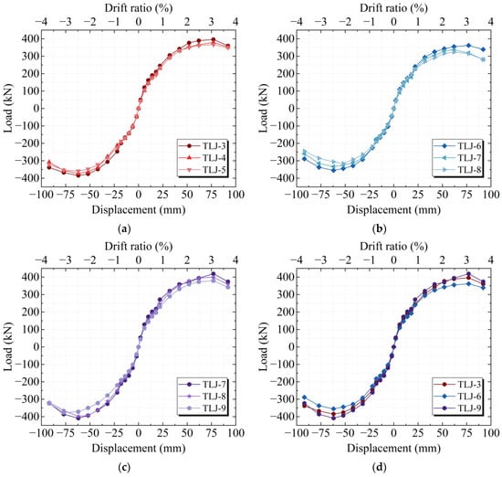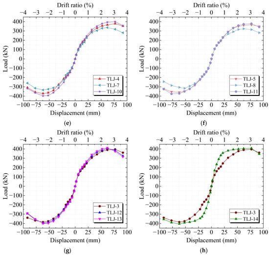 Comparison of skeleton curves (TLJ-3~TLJ-14): (a) TLJ-3~TLJ-5; (b) TLJ-6~TLJ-8; (c) TLJ-9~TLJ-11; (d) TLJ-3, TLJ-6, and TLJ-9; (e) TLJ-4, TLJ-7, and TLJ-10; (f) TLJ-5, TLJ-8, and TLJ-11; (g) TLJ-3, TLJ-12, and TLJ-13; (h) TLJ-3 and TLJ-14.