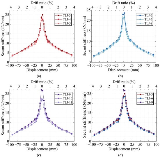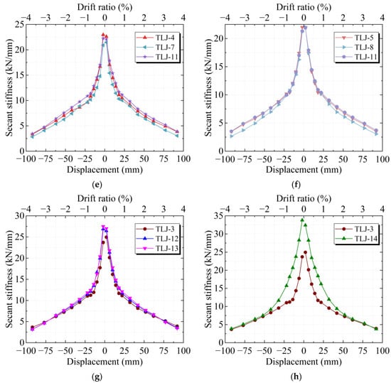 Comparison of secant stiffness degradation curves (TLJ-3~TLJ-14): (a) TLJ-3~TLJ-5; (b) TLJ-6~TLJ-8; (c) TLJ-9~TLJ-11; (d) TLJ-3, TLJ-6, and TLJ-9; (e) TLJ-4, TLJ-7, and TLJ-10; (f) TLJ-5, TLJ-8, and TLJ-11; (g) TLJ-3, TLJ-12, and TLJ-13; (h) TLJ-3 and TLJ-14.