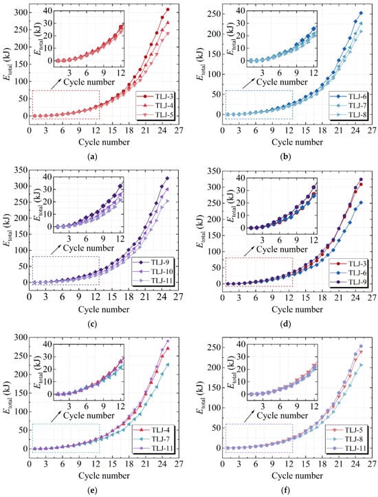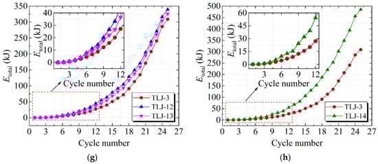 Comparison of energy dissipation curves (TLJ-3~TLJ-14): (a) TLJ-3~TLJ-5; (b) TLJ-6~TLJ-8; (c) TLJ-9~TLJ-11; (d) TLJ-3, TLJ-6, and TLJ-9; (e) TLJ-4, TLJ-7, and TLJ-10; (f) TLJ-5, TLJ-8, and TLJ-11; (g) TLJ-3, TLJ-12, and TLJ-13; (h) TLJ-3 and TLJ-14.