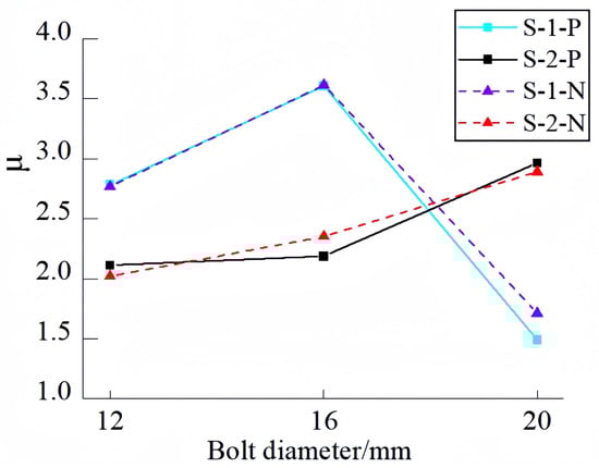 - Energy Dissipation and Ductility Control. The tests revealed that notch-bolted connections exhibit superior energy dissipation capacity compared to ordinary bolted connections of the same diameter. However, for smaller diameters (12 mm and 16 mm), the ductility of notch-bolted connections is inferior to that of ordinary bolted connections. Therefore, for smaller bolt diameters, ordinary bolted connections are preferred, but large-diameter or high-strength bolts should be avoided due to their poor ductility. In the tests, 16 mm bolts demonstrated better ductility (ξ = 3.6) compared to 20 mm bolts. For larger bolt diameters, notch-bolted connections are recommended due to their more stable ductility performance;