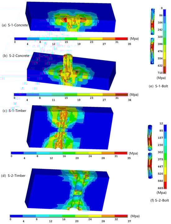 - Timber: Significant differences exist in timber stress distribution between the two connection types. For the common bolt connection (S-1-16), the high-stress region extends extensively throughout the timber surrounding the bolt (Figure 18c). For the notch-bolted connection (S-2-16), the stress concentration is markedly reduced compared to S-1-16, and the stress level remains below the timber’s compressive strength (Figure 18d). This explains the experimental observation that the timber in notch-bolted connections remained intact (Figure 5h), as evidenced by the lower simulated stress;